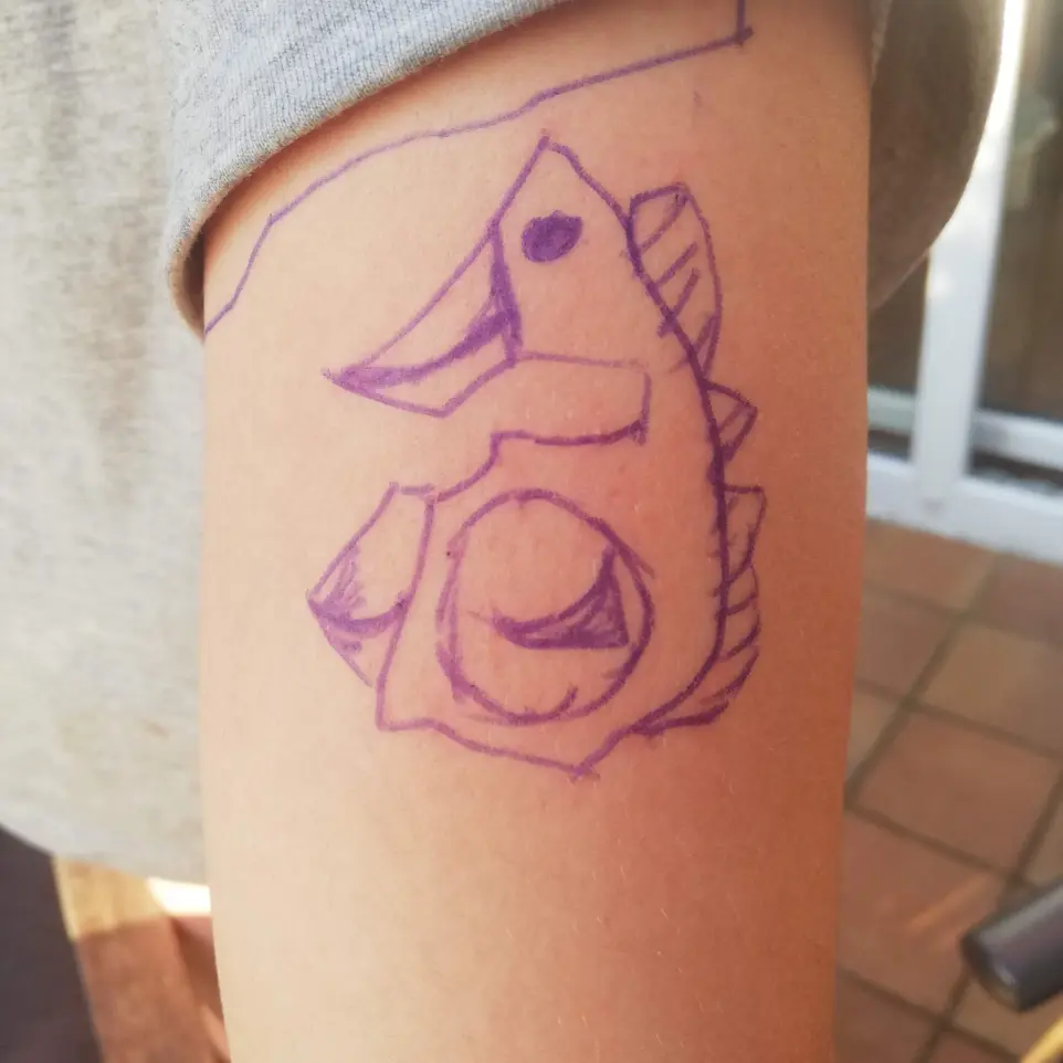 Un jour, intriguée par les tatouages sur mon bras, elle m’a proposé d’y dessiner. Quelques minutes plus tard, de son imagination, est né le Dragon Canard.